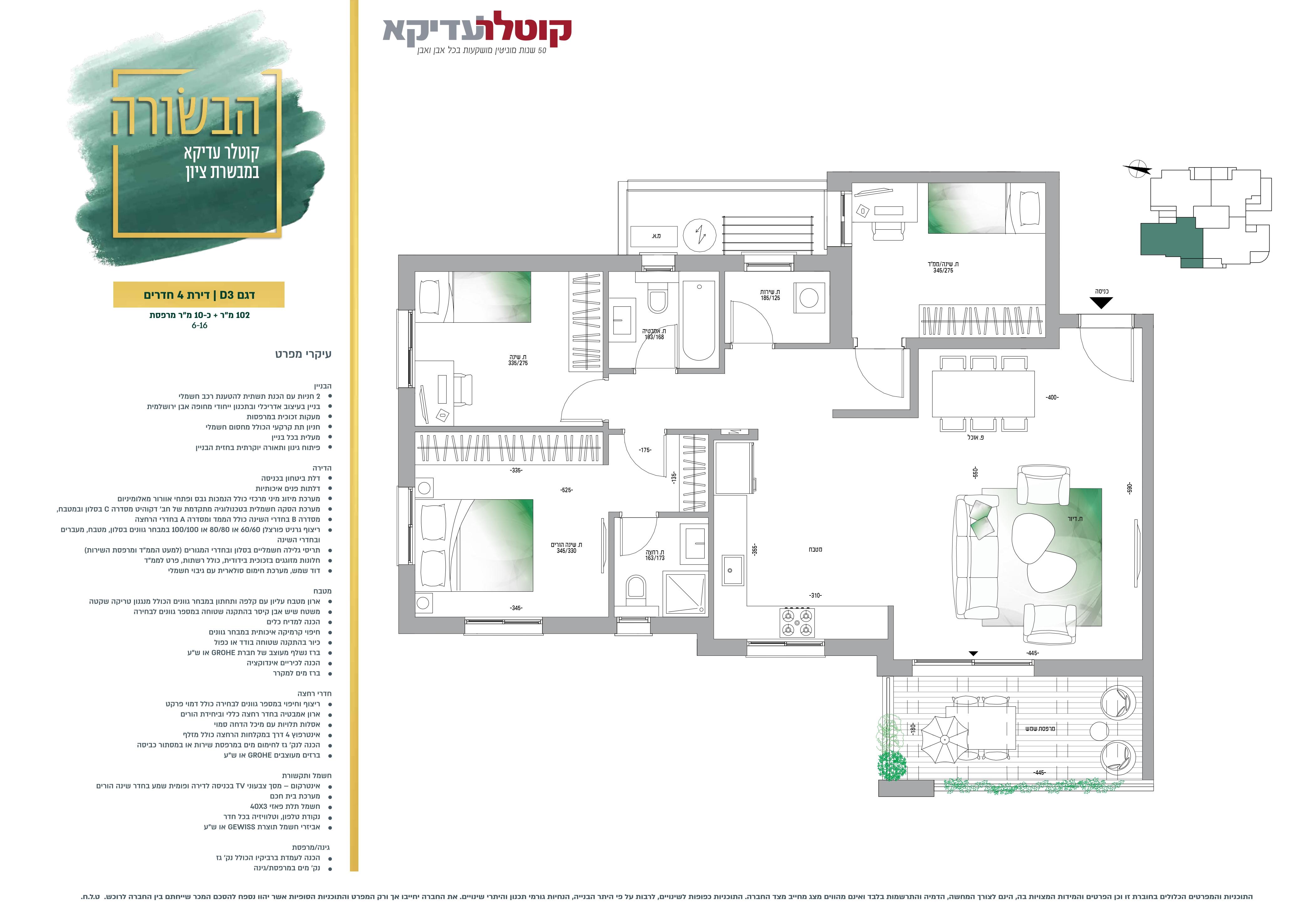 הפרויקט נהנה ממיקום מושלם בשכונה ומציע לדיירים דירות מעוצבות ומרווחות, המציעות חוויית מגורים יוקרתית. הפרויקט כולל 6 בניינים, ובהם 120 דירות בלבד, בתמהיל מגוון הכולל: